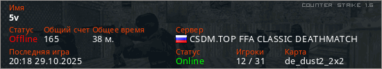 Играет на Counter Strike 1.6 сервере. Страна: РоссияПервый раз замечен 17:59 29.10.2025