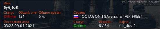 Играет на Counter Strike Source сервере. Страна: РоссияПервый раз замечен 12:01 07.03.2020