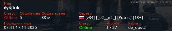 Играет на Counter Strike Source сервере. Страна: РоссияПервый раз замечен 17:32 26.02.2024
