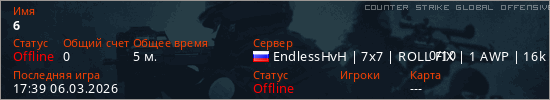 Играет на Counter Strike Global Offensive сервере. Страна: РоссияПервый раз замечен 17:37 06.03.2026