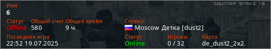 Играет на Counter Strike 1.6 сервере. Страна: РоссияПервый раз замечен 11:31 11.08.2020