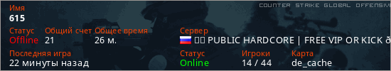 Играет на Counter Strike Global Offensive сервере. Страна: РоссияПервый раз замечен 21:33 20.10.2025