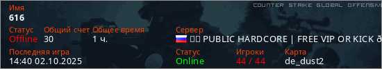 Играет на Counter Strike Global Offensive сервере. Страна: РоссияПервый раз замечен 07:39 29.07.2025