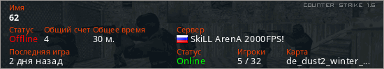 Играет на Counter Strike 1.6 сервере. Страна: РоссияПервый раз замечен 19:55 14.02.2025