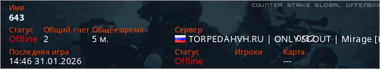 Играет на Counter Strike Global Offensive сервере. Страна: РоссияПервый раз замечен 13:23 31.01.2026