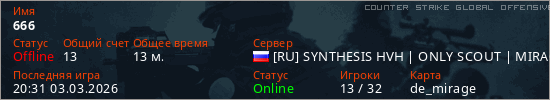 Играет на Counter Strike Global Offensive сервере. Страна: РоссияПервый раз замечен 17:22 03.03.2026