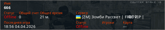 Играет на Counter Strike 1.6 сервере. Страна: УкраинаПервый раз замечен 15:07 29.03.2026