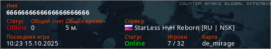 Играет на Counter Strike Global Offensive сервере. Страна: РоссияПервый раз замечен 09:48 15.10.2025