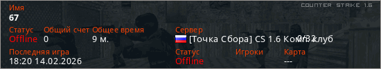 Играет на Counter Strike 1.6 сервере. Страна: РоссияПервый раз замечен 17:53 14.02.2026