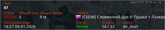 Играет на Counter Strike 1.6 сервере. Страна: РоссияПервый раз замечен 16:39 30.12.2025