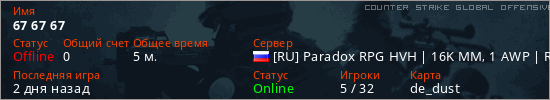 Играет на Counter Strike Global Offensive сервере. Страна: РоссияПервый раз замечен 13:09 14.03.2026