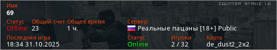 Играет на Counter Strike 1.6 сервере. Страна: РоссияПервый раз замечен 14:14 07.01.2023