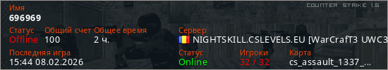 Играет на Counter Strike 1.6 сервере. Страна: РумынияПервый раз замечен 23:53 01.02.2026