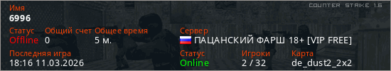 Играет на Counter Strike 1.6 сервере. Страна: РоссияПервый раз замечен 18:10 11.03.2026
