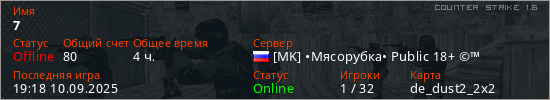 Играет на Counter Strike 1.6 сервере. Страна: РоссияПервый раз замечен 21:23 10.05.2023