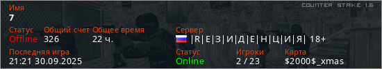 Играет на Counter Strike 1.6 сервере. Страна: РоссияПервый раз замечен 19:45 27.02.2019