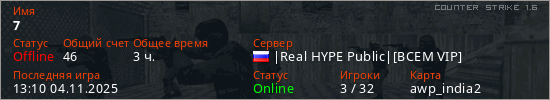 Играет на Counter Strike 1.6 сервере. Страна: РоссияПервый раз замечен 14:46 07.01.2024
