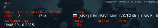 Играет на Counter Strike Global Offensive сервере. Страна: РоссияПервый раз замечен 11:21 28.10.2025