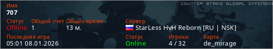 Играет на Counter Strike Global Offensive сервере. Страна: РоссияПервый раз замечен 02:42 08.01.2026