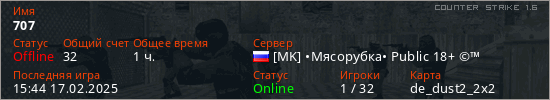 Играет на Counter Strike 1.6 сервере. Страна: РоссияПервый раз замечен 19:07 23.04.2023