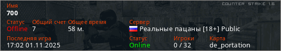 Последний раз был в сети 17:02 01.11.2025 Игрок с таким ником замечен на 42 серверах