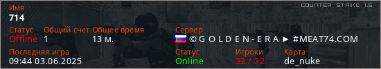 Играет на Counter Strike 1.6 сервере. Страна: РоссияПервый раз замечен 18:38 15.10.2023