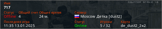 Играет на Counter Strike 1.6 сервере. Страна: РоссияПервый раз замечен 10:48 09.09.2022