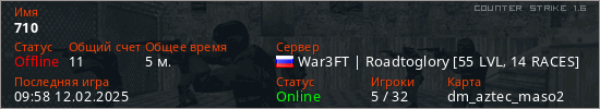 Играет на Counter Strike 1.6 сервере. Страна: РоссияПервый раз замечен 09:52 12.02.2025