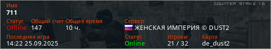Последний раз был в сети 14:22 25.09.2025 Игрок с таким ником замечен на 28 серверах