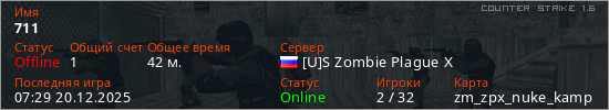 Играет на Counter Strike 1.6 сервере. Страна: РоссияПервый раз замечен 20:44 09.01.2024