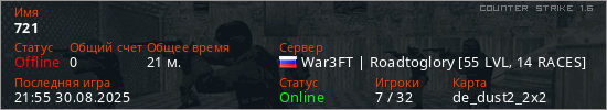 Последний раз был в сети 21:55 30.08.2025 Игрок с таким ником замечен на 25 серверах