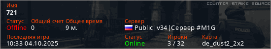 Играет на Counter Strike Source сервере. Страна: РоссияПервый раз замечен 08:07 04.10.2025