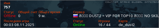 Играет на Counter Strike Global Offensive сервере. Страна: РоссияПервый раз замечен 22:45 07.11.2025