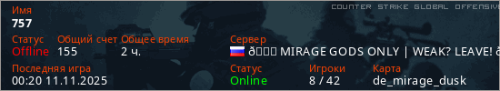Играет на Counter Strike Global Offensive сервере. Страна: РоссияПервый раз замечен 05:26 15.04.2025