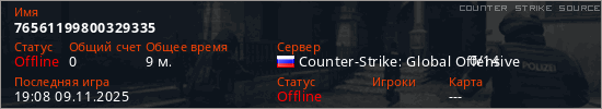 Играет на Counter Strike Source сервере. Страна: РоссияПервый раз замечен 15:28 03.09.2025