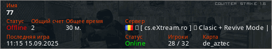 Играет на Counter Strike 1.6 сервере. Страна: РумынияПервый раз замечен 18:07 24.10.2024