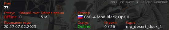 Играет на Call of Duty 4: Modern Warfare сервере. Страна: РоссияПервый раз замечен 20:48 07.02.2025