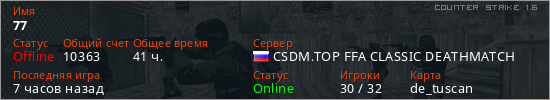 Играет на Counter Strike 1.6 сервере. Страна: РоссияПервый раз замечен 17:09 16.02.2020