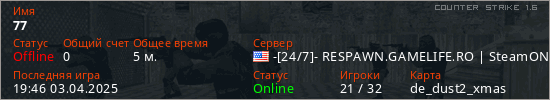 Последний раз был в сети 19:46 03.04.2025 Игрок с таким ником замечен на 48 серверах