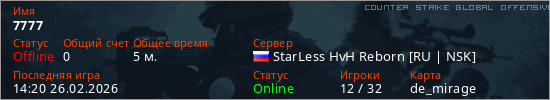 Играет на Counter Strike Global Offensive сервере. Страна: РоссияПервый раз замечен 13:30 26.02.2026