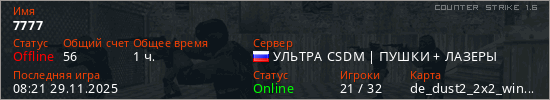 Играет на Counter Strike 1.6 сервере. Страна: РоссияПервый раз замечен 07:39 22.02.2024