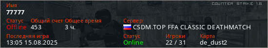 Последний раз был в сети 13:05 15.08.2025 Игрок с таким ником замечен на 32 серверах