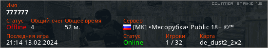 Играет на Counter Strike 1.6 сервере. Страна: РоссияПервый раз замечен 16:15 23.07.2023
