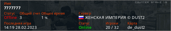 Последний раз был в сети 14:19 28.02.2023 Игрок с таким ником замечен на 30 серверах