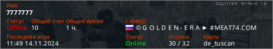 Играет на Counter Strike 1.6 сервере. Страна: РоссияПервый раз замечен 12:51 16.03.2023