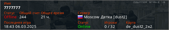 Играет на Counter Strike 1.6 сервере. Страна: РоссияПервый раз замечен 16:30 24.08.2020