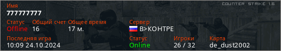 Играет на Counter Strike 1.6 сервере. Страна: РоссияПервый раз замечен 10:38 17.05.2024