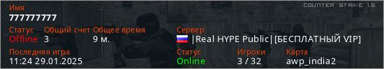 Играет на Counter Strike 1.6 сервере. Страна: РоссияПервый раз замечен 17:13 24.12.2024
