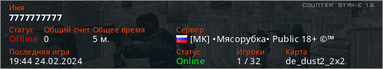 Играет на Counter Strike 1.6 сервере. Страна: РоссияПервый раз замечен 19:42 24.02.2024