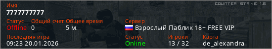 Играет на Counter Strike 1.6 сервере. Страна: РоссияПервый раз замечен 06:25 20.01.2026